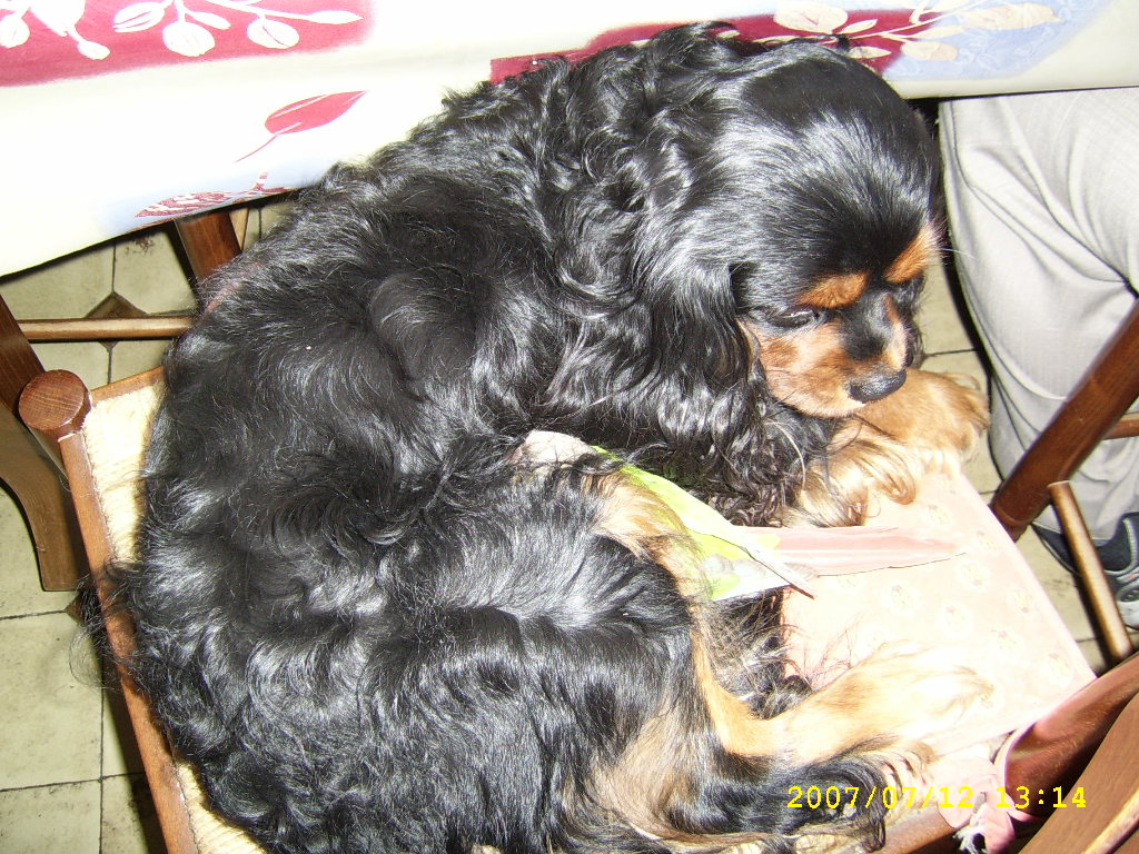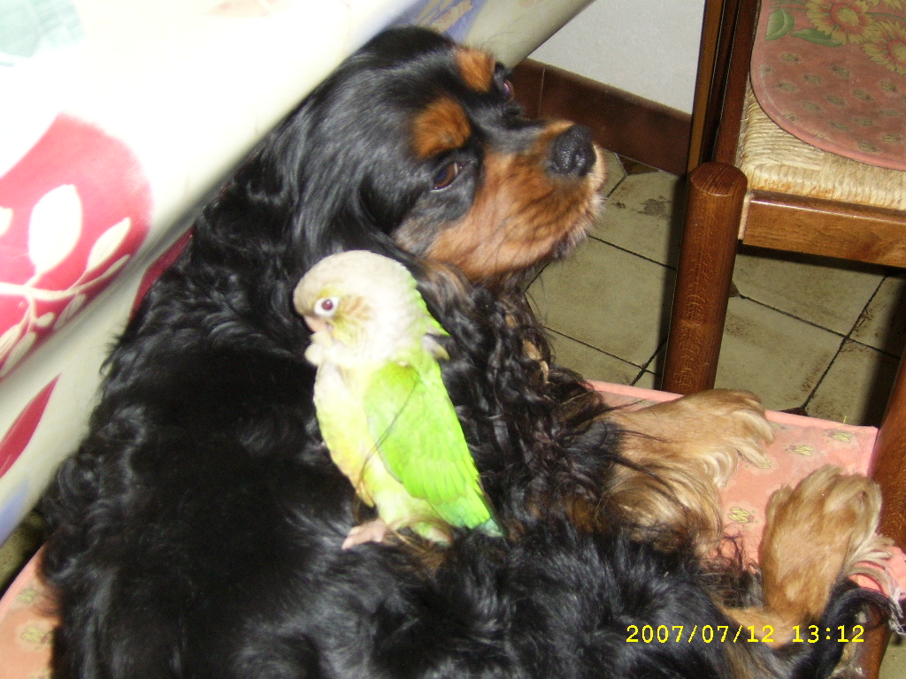 Voici une photo de Caly avec mon cavalier. Depuis que je l'ai c'est le grand amour, elle est souvent entre ses pattes en train de dormir.[/img]