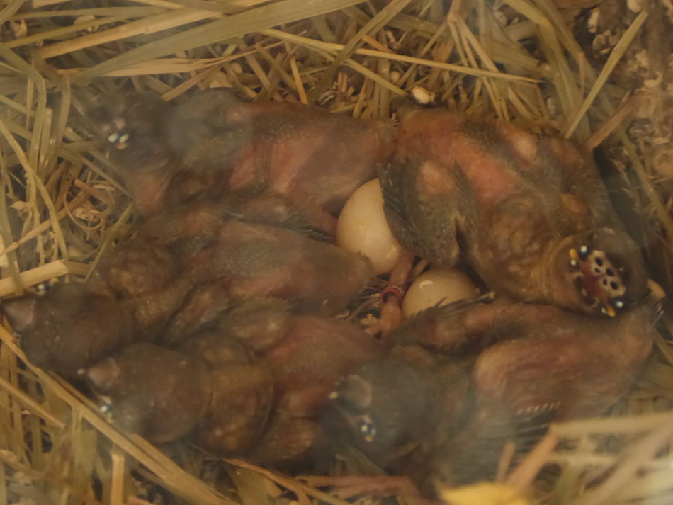 Il y a quelques jours , j'ai voulu les changer et c'est là que j'ai découvert un nid avec des oeufs ... J'ai donc laisser faire ! vous pouvez voir sur une autre photos que des naissances ont eu lieu , les jeunes seront bagués demain matin . Une autre photo avec une nichée de goulds ! Cordialement toujours . J2L.